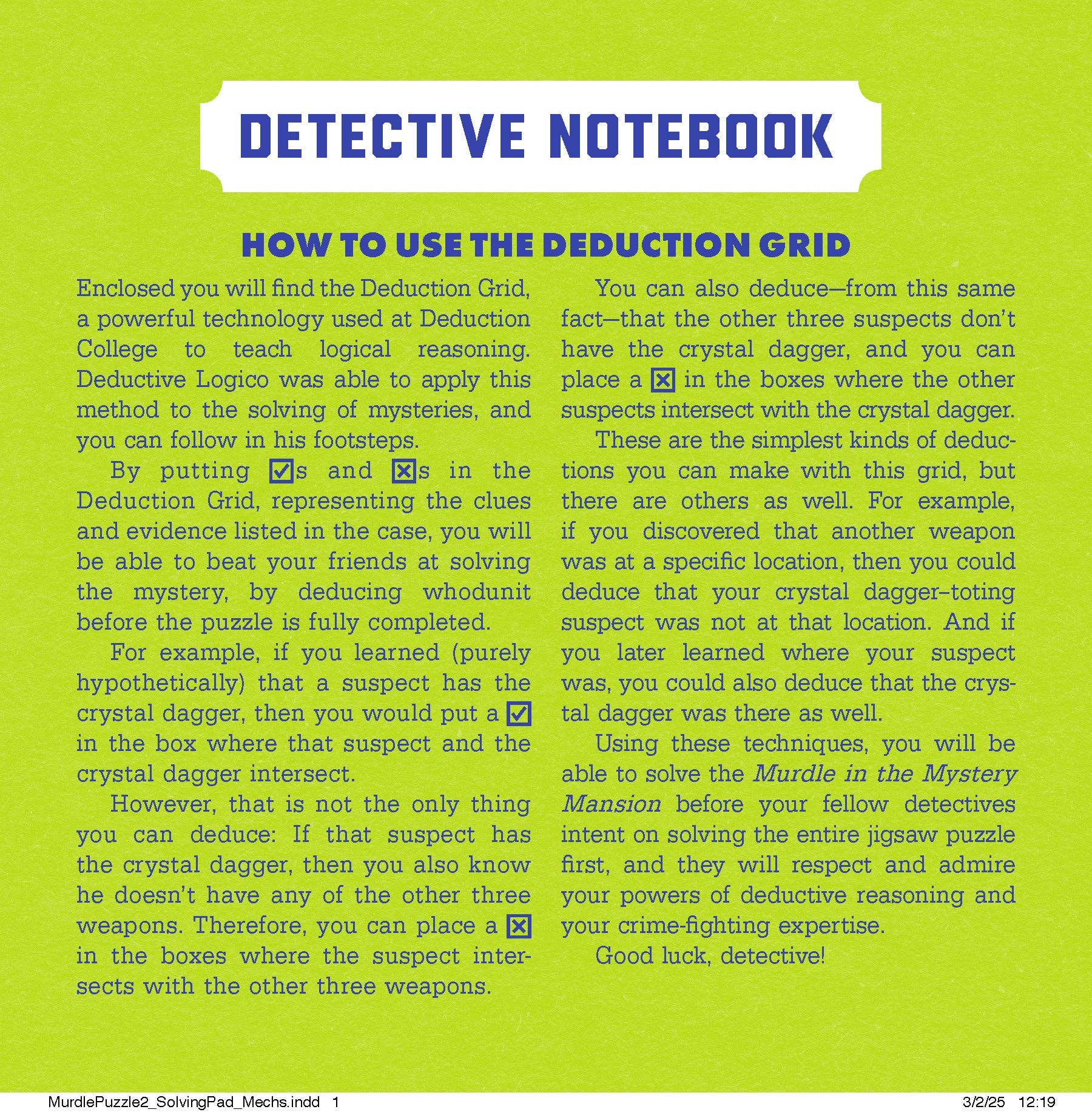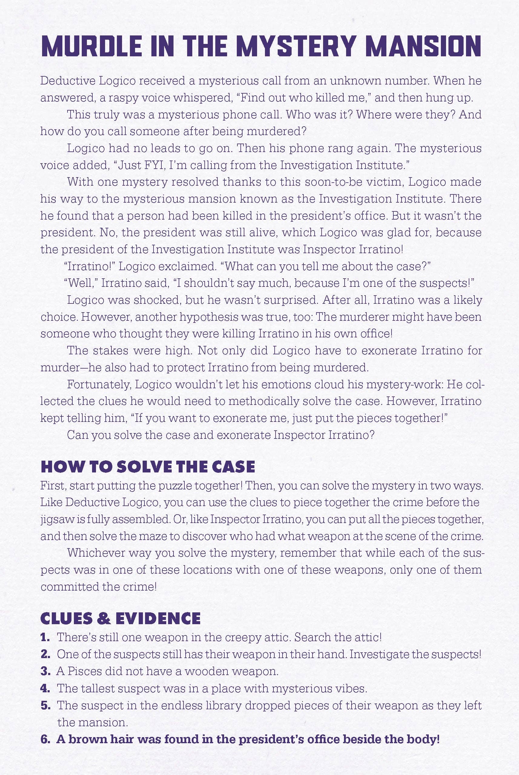There's been a murder in Dame Obsidian’s mystery mansion, and Deductive Logico is on the case. This 500-piece jigsaw puzzle is a challenging combination of logic puzzle, jigsaw puzzle, and maze. Test your puzzle-building skills and your powers of deduction as you uncover who committed the murder. To play, open the puzzle box to find a Murdle story and logic puzzle printed inside, complete with clues, suspects, weapons, and locations. Detectives must assemble the jigsaw puzzle without a full image to guide them, use the logic grids in their detective notebook to evaluate the evidence, and solve the maze within the puzzle image to solve the crime.
