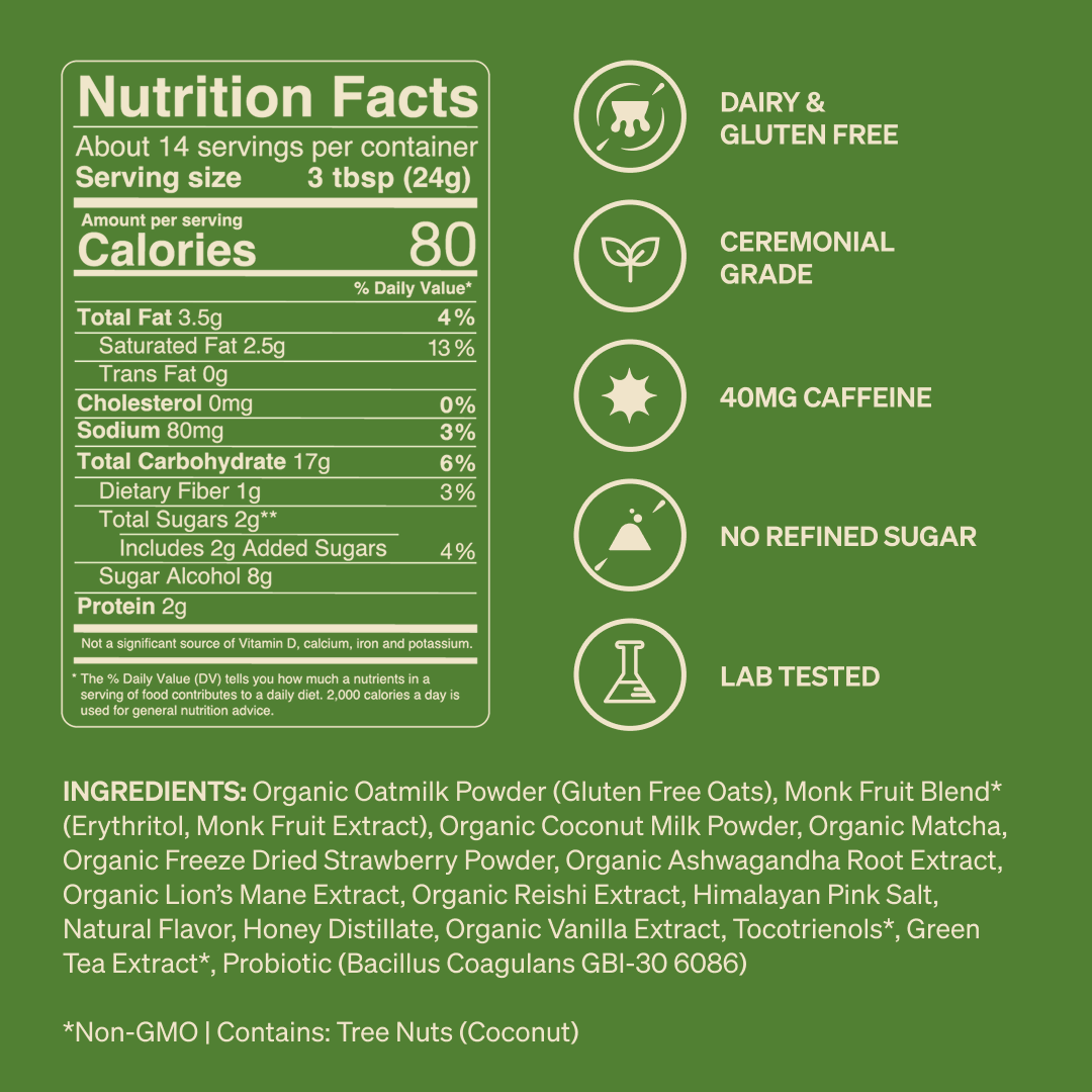This dreamy, midsummer latte blends ceremonial matcha with real juicy sun-ripened strawberries and a hint of creamy vanilla. Like a spoonful of strawberry shortcake, but sippable. Designed to be divine over ice. Boosted with adaptogens and mushrooms for more energy, less stress & better focus. With creamer already in the mix, this is the easiest strawberry matcha you've ever seen.