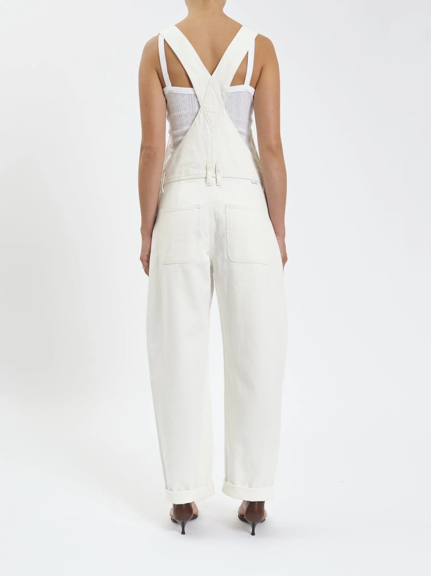 Our first ever Barrel leg overalls are in a white color with an off-the-moment barrel leg silhouette. With a structured non stretch denim, the option to accessorize with belt loops, nothing can stop you in the Canyon.