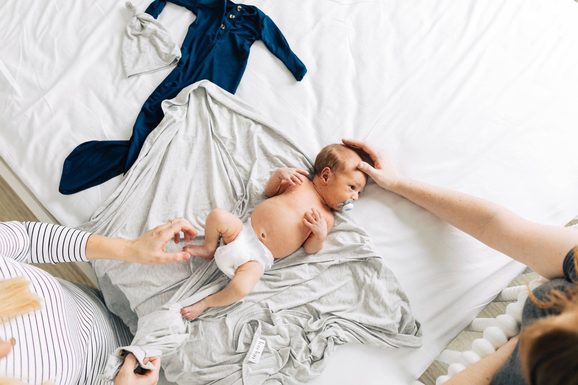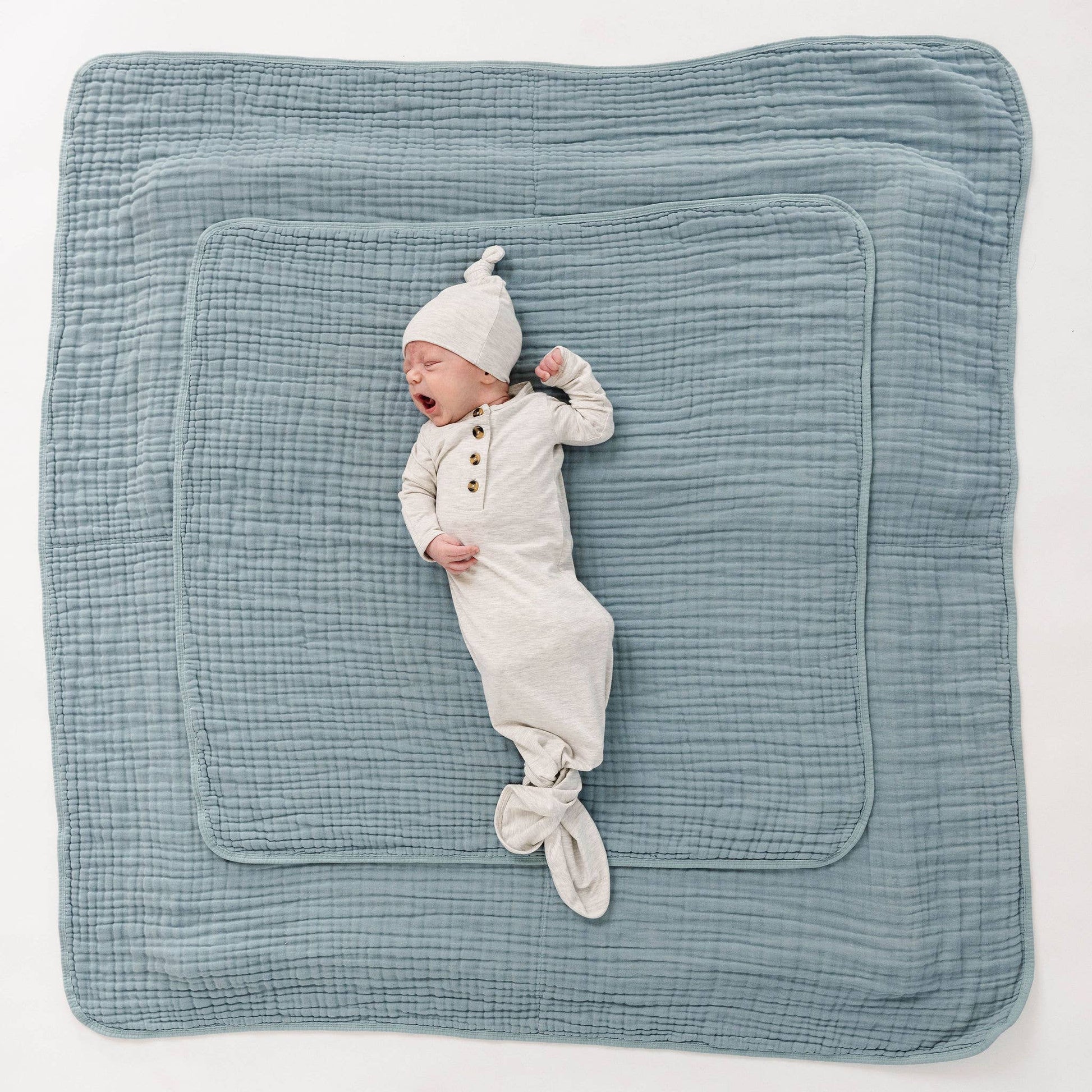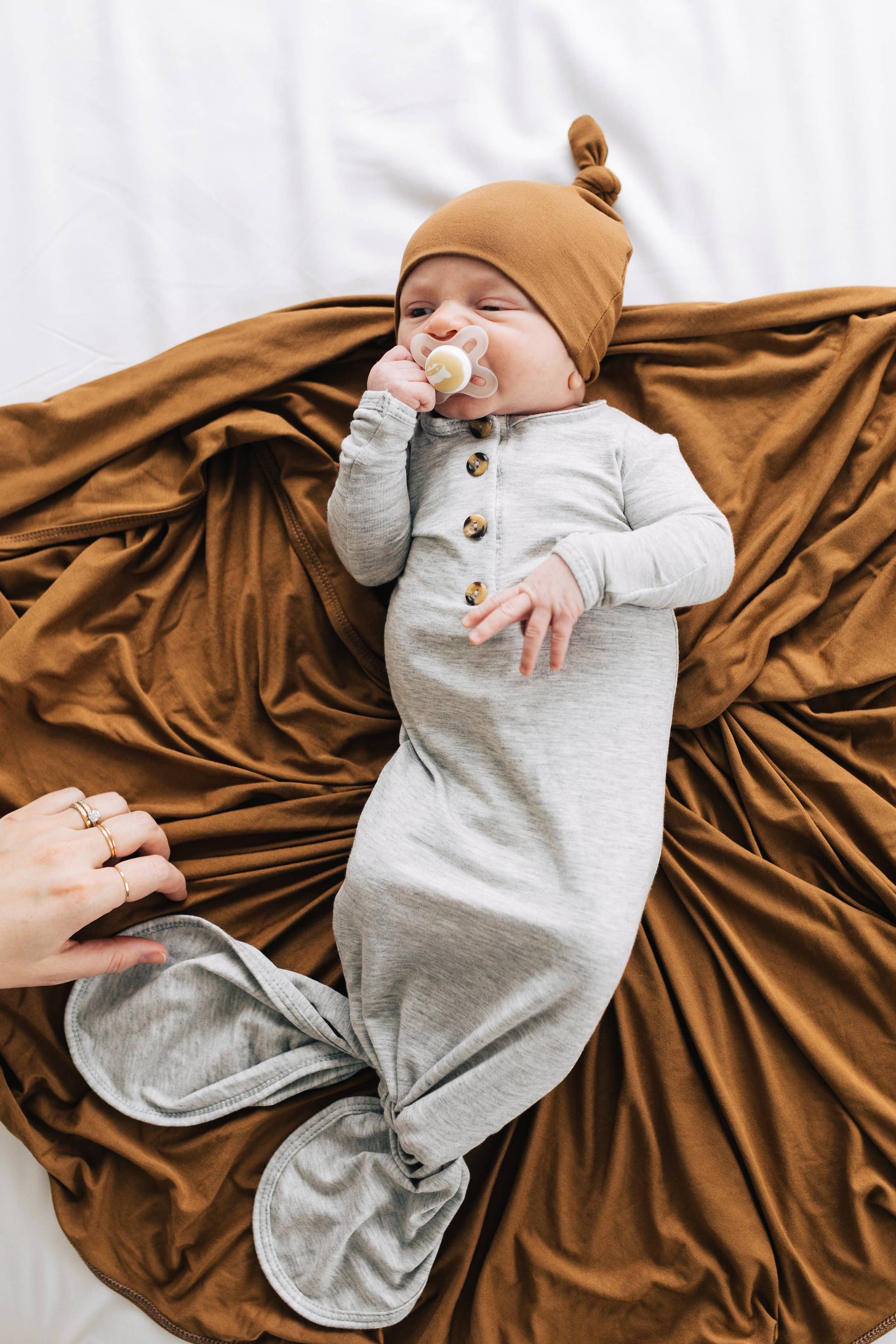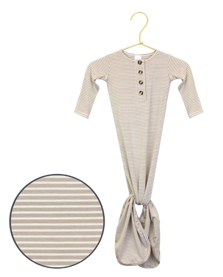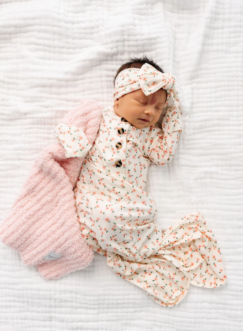 The easiest tie-bottom outfit for day or night. Made for hassle free diaper changes and gentle dressing, I designed this with a button-down front and tie bottom for simple closure (no more snaps at 2am!). Fold over wrist cuffs are the most thoughtful finishing touch.