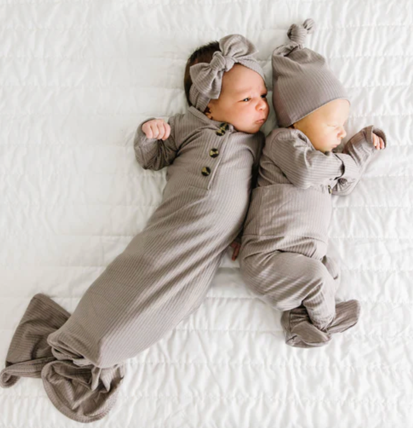 The easiest tie-bottom outfit for day or night. Made for hassle free diaper changes and gentle dressing, I designed this with a button-down front and tie bottom for simple closure (no more snaps at 2am!). Fold over wrist cuffs are the most thoughtful finishing touch.