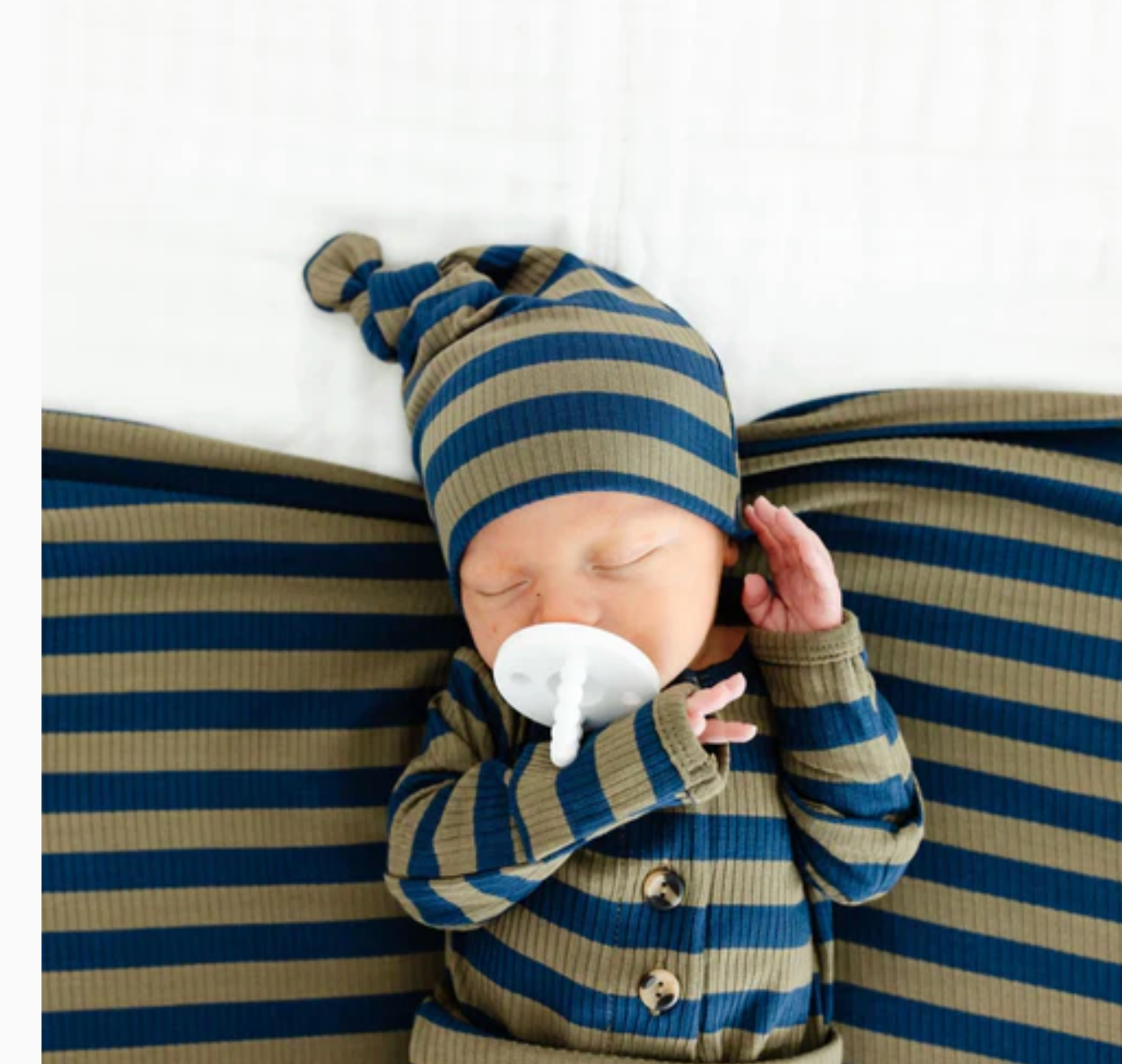 The easiest tie-bottom outfit for day or night. Made for hassle free diaper changes and gentle dressing, I designed this with a button-down front and tie bottom for simple closure (no more snaps at 2am!). Fold over wrist cuffs are the most thoughtful finishing touch.