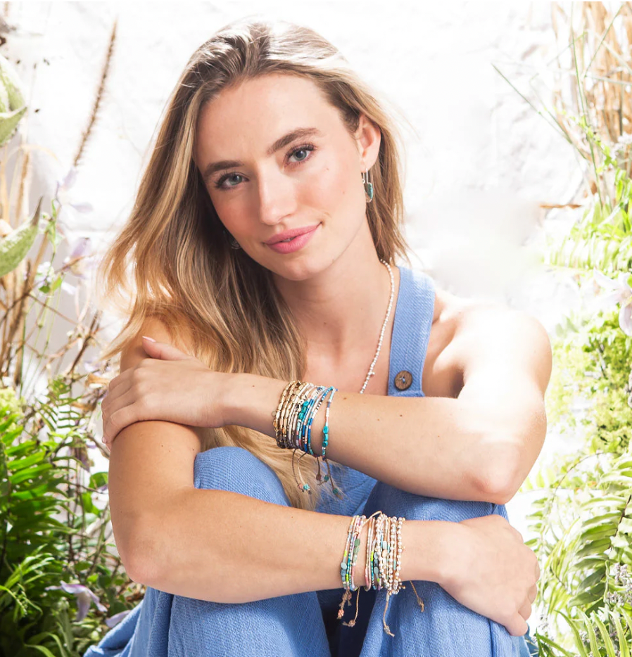 The semi-precious stone and its meaning are highlighted on the back on each card and connect to the photograph on the front of the card. Each playful stacking bracelet incorporates semi-precious stones along with Japanese glass Miyuki beads.