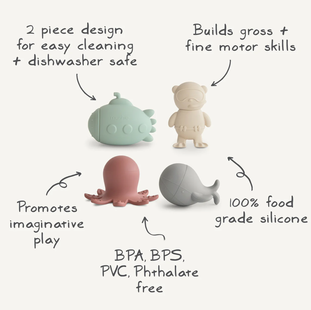 Make a splash at bathtime with the sealife bath play set that includes a submarine, scuba diver, octopus and whale. Made from 100% food grade silicone, the soft material is easy for little hands to hold while wet or dry. Its inventive design allows each toy to open into two separate pieces for thorough cleaning and fast drying. This feature allows the toys to remain mold-free with its easy-to-clean pieces that are dishwasher safe. After each use, we recommend opening the pieces to rinse out and air dry before storing.