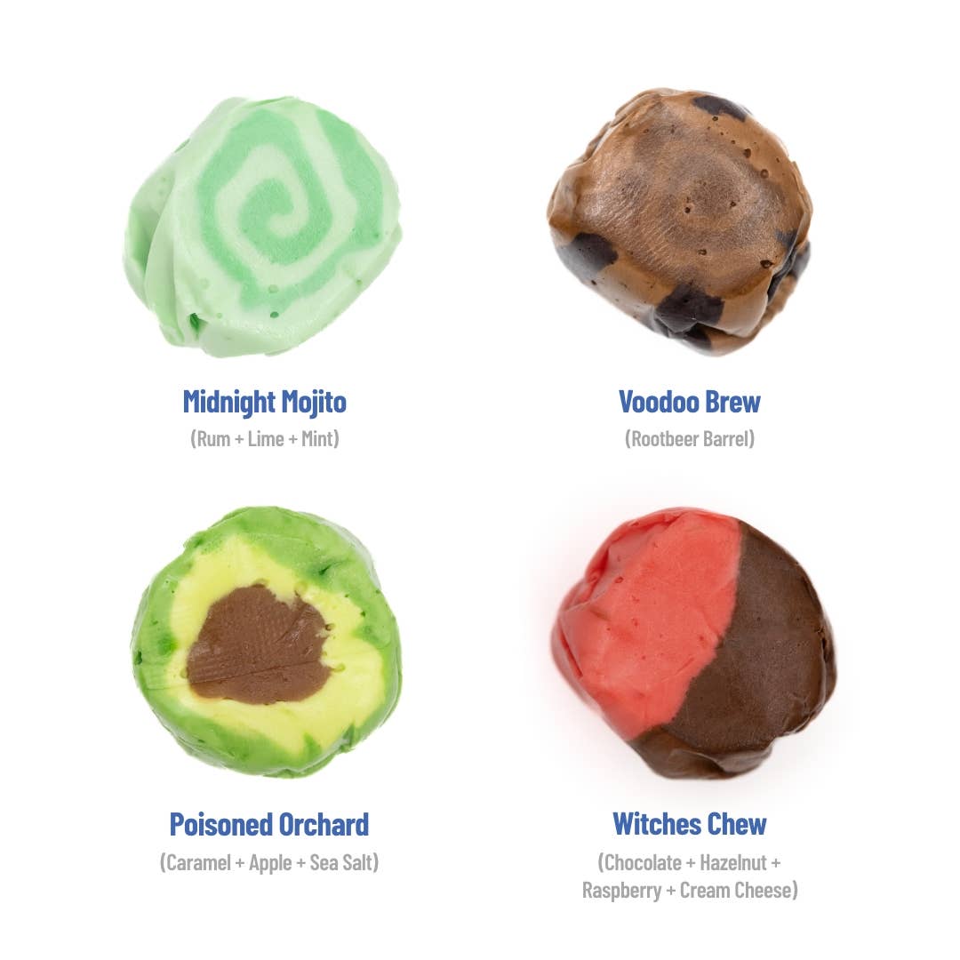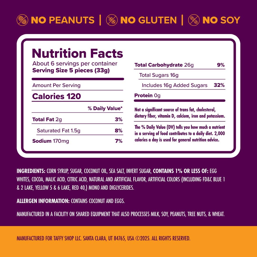 Let yourself be charmed by this one-of-a-kind bag at Halloween time or year round. Taffy Shop's saltwater taffy is guaranteed fresh. Made with love in the USA. Includes an assortment of some of our best-selling taffy flavors.